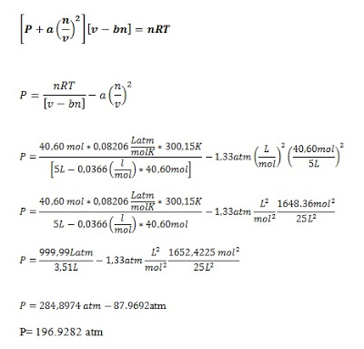Por ejemplo, 1 m3 de aire a 27 °C y 1 atm se comprime hasta un volumen de 5 litros a temperatura constante. Calcular la presión final empleando la ecuación de Van der Waals. Las constantes experimentales de la ecuación de Van der Waals para el aire son: