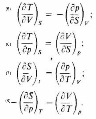 Estas cuatro ecuaciones suelen denominarse Ecuaciones fundamentales de la termodinámica. La ecuación (1) relaciona las variaciones de la energía con variaciones de entropía y volumen. La ecuación (2) relaciona las variaciones de entalpía con las de entropía y presión. La ecuación (3) relaciona las variaciones de la energía de Helmholtz dA con cambios de la temperatura y del volumen. La ecuación (4) relaciona las variaciones de la energía de Gibbs con variaciones de temperatura y presión. Como las expresiones del segundo término de estas ecuaciones son diferenciales exactas, sus derivadas cruzadas serán iguales. De esta manera, se obtienen las cuatro relaciones de Maxwell: